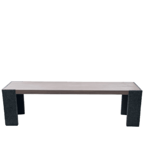 Las bancas para parques pueden fabricarse con diferentes materiales para el asiento y respaldo, incluyendo tablones de madera con acabado de poliuretano marino, perfiles de plasti-madera, o lámina de acero calibre 12 (ya sea acero al carbón o acero inoxidable), que puede incorporar diseños personalizados como logotipos calados mediante corte láser y pinturas electrostáticas. El diseño de la banca es simple y elegante, fabricada en polietileno de media densidad 100% reciclado, con capacidad para acomodar de 3 a 6 personas y con resistencia a las inclemencias del tiempo.