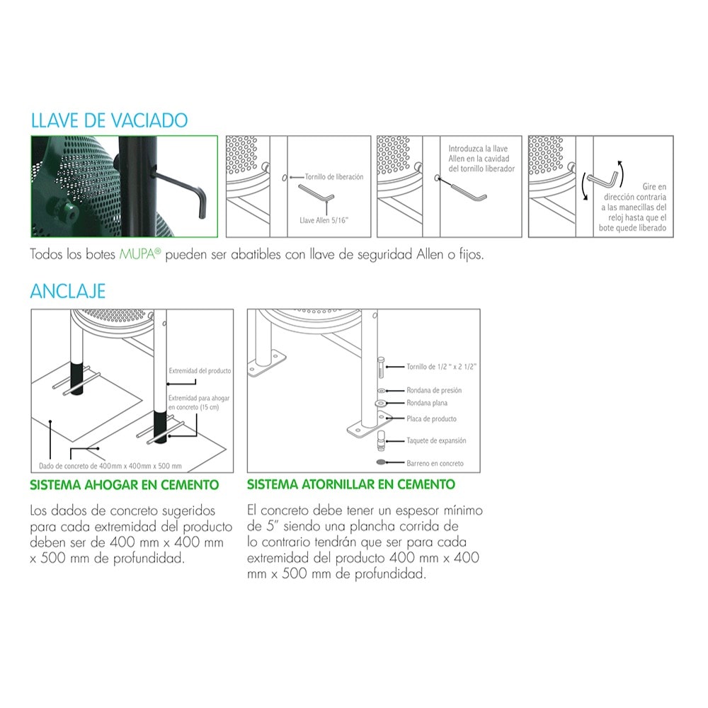 Anclaje: Atornillar, ahogar en cemento o movible.
