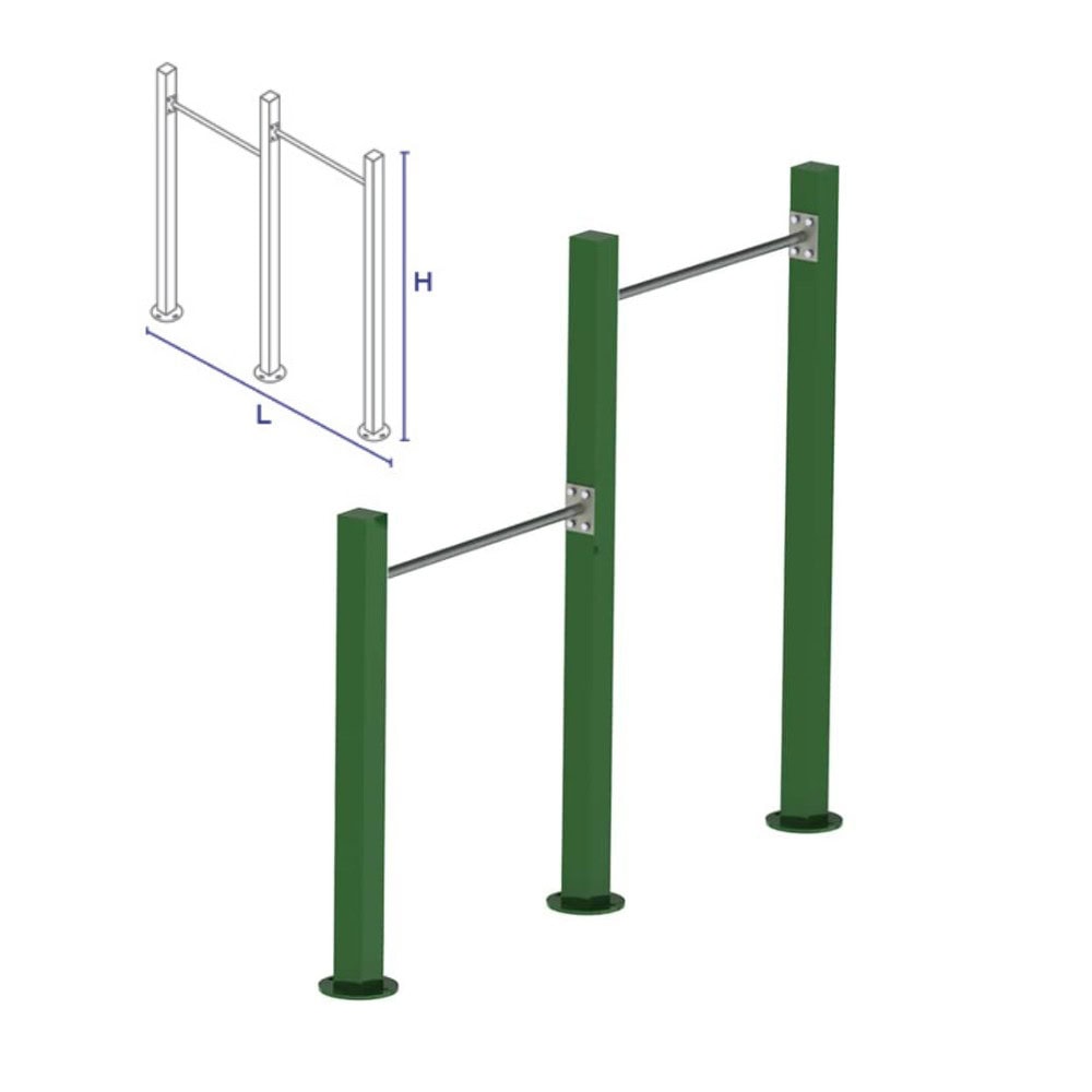 Las Barras Horizontales MUPA 105 están diseñadas para fortalecer hombros, espalda y pecho en usuarios mayores de 15 años, siendo ideales para rutinas de entrenamiento al aire libre. Están fabricadas con postes de acero al carbón con pintura electrostática, tubulares de contacto de cédula de acero galvanizado y tornillería galvanizada, lo que garantiza una estructura resistente, segura y duradera en exteriores. Con un diseño compacto y funcional, y disponibles en una amplia variedad de colores, estas barras son una excelente opción para parques, gimnasios urbanos y espacios deportivos comunitarios.