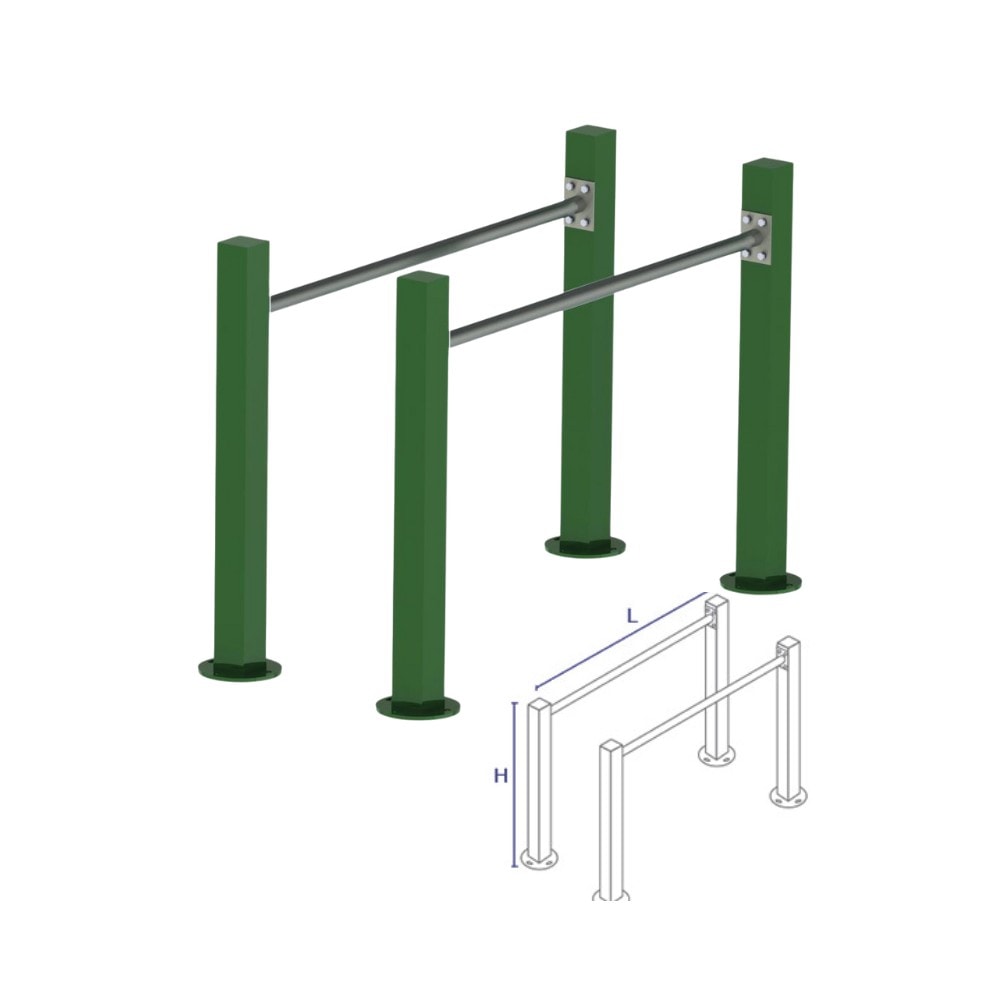 Material: Postes en acero al carbón con pintura electrostática, tubulares de contacto de cédula de acero galvanizado y tornillería en acero galvanizado.