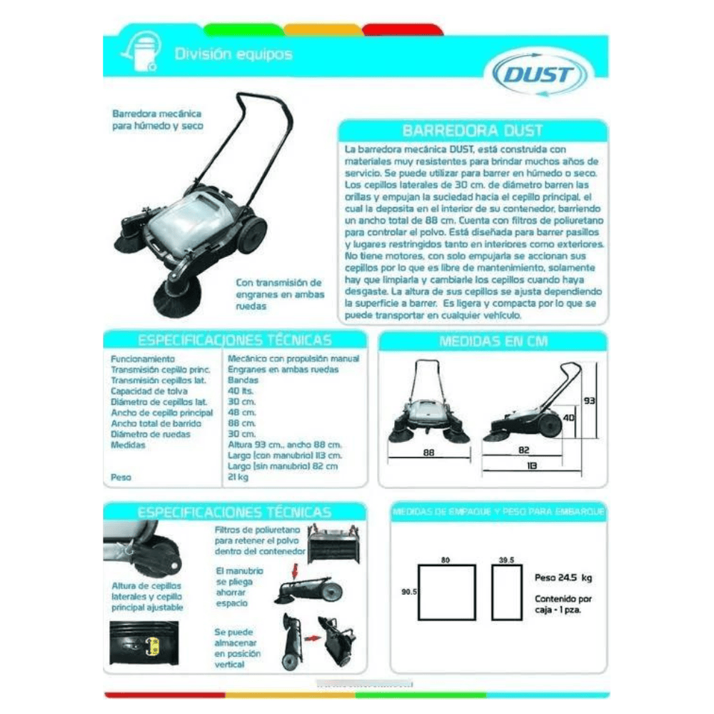 La barredora cuenta con filtros de poliuretano para controlar el polvo y no requiere motores, ya que sus cepillos se accionan simplemente al empujarla. Es libre de mantenimiento, solo necesita limpieza y cambio de cepillos, los cuales se ajustan a la superficie. Su diseño ligero y compacto permite transportarla fácilmente en cualquier vehículo.