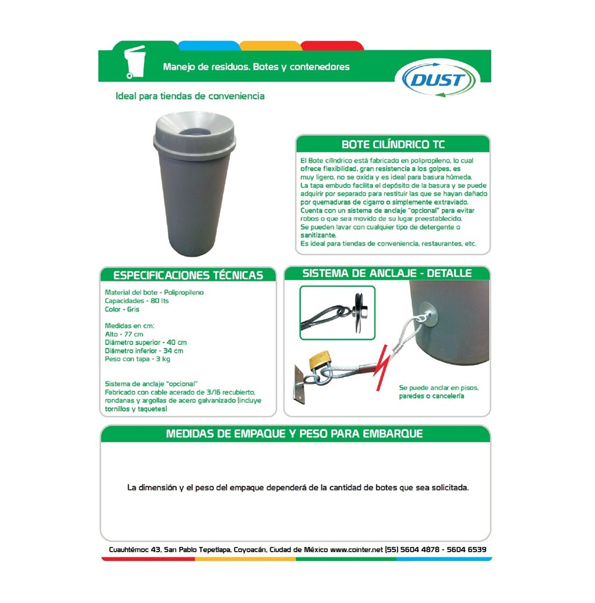El Bote Cilíndrico de 80 Litros TC presenta las siguientes características destacadas: primero, está fabricado en polipropileno, un material que garantiza una excelente resistencia a golpes y condiciones adversas, además de prevenir la oxidación, lo que asegura una larga vida útil y un mantenimiento mínimo. Segundo, cuenta con una tapa embudo que facilita la inserción de desechos sin causar derrames y puede ser reemplazada fácilmente en caso de daño o pérdida, manteniendo así su funcionalidad y estética. Tercero, ofrece un sistema de anclaje opcional que permite asegurar el contenedor a diferentes superficies en entornos donde el robo o el movimiento puedan ser un problema, proporcionando una seguridad adicional.