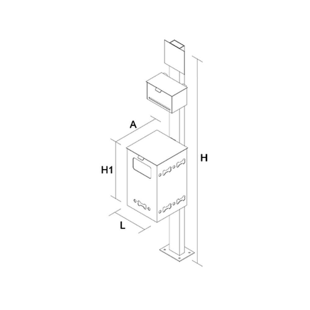 Referencia (mm): Bote: H 1800, H1 500, A 430, L 310; Caja para bolsitas: H2 150, L 250, A1 150