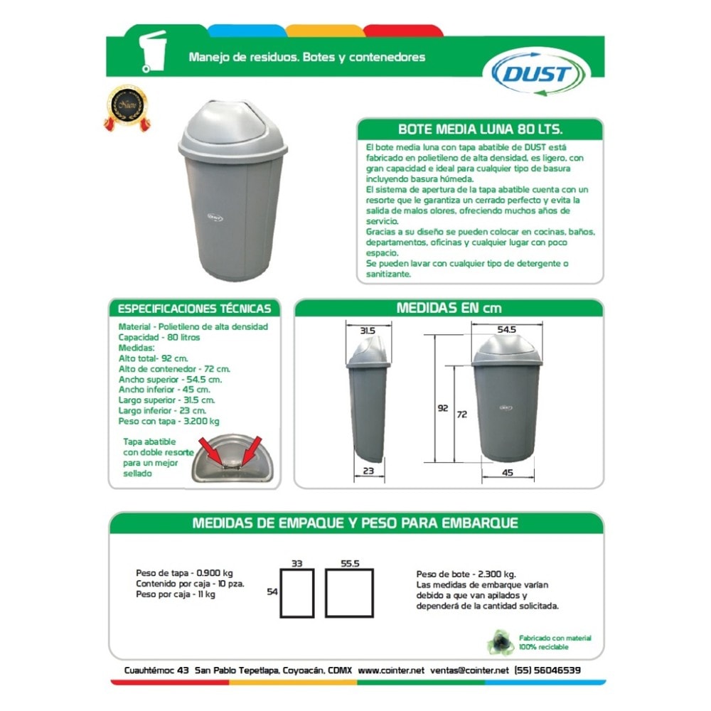El contenedor media luna con tapa abatible de Dust está fabricado en polietileno de alta densidad, lo que lo hace ligero y con gran capacidad, siendo ideal para cualquier tipo de basura, incluyendo residuos húmedos. Su sistema de apertura con tapa abatible y resorte garantiza un cierre perfecto que evita la salida de malos olores, ofreciendo muchos años de servicio. Gracias a su diseño compacto, es adecuado para espacios reducidos como cocinas, baños, departamentos y oficinas. Además, se puede lavar con cualquier tipo de detergente o sanitizante, facilitando su mantenimiento y limpieza.