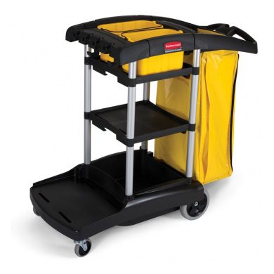 El carro de limpieza de limpieza comercial Rubbermaid es una solución con espacio para complementos y accesorios adicionales para satisfacer sus necesidades.