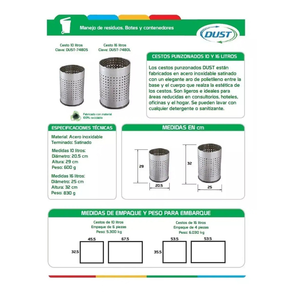 El cesto punzonado DUST se puede lavar con cualquier tipo de detergente o sanitizante, lo que facilita su mantenimiento y asegura su durabilidad a lo largo del tiempo. Su diseño y tamaño proporcionan una presentación elegante, lo que permite que se pueda colocar en cualquier tipo de espacio sin comprometer su estética.
