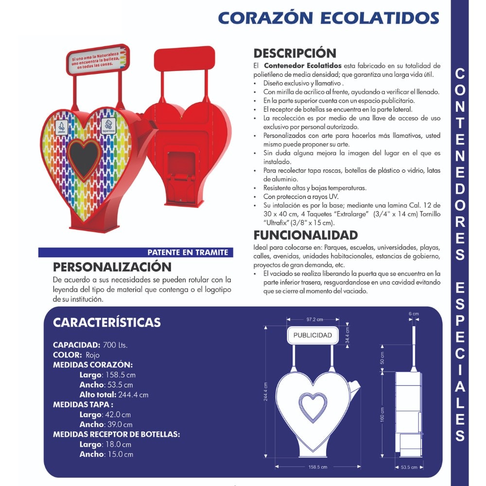 Este contenedor presenta un diseño exclusivo y llamativo, con la opción de personalizar el arte gráfico. Incluye una mirilla de acrílico en la parte frontal para verificar el nivel de llenado y su diseño atractivo fomenta el reciclaje de materiales plásticos. Es resistente a altas y bajas temperaturas, y cuenta con protección contra rayos UV. Además, dispone de un espacio publicitario especial en la parte superior y un receptor de botellas ubicado en el lateral. Está diseñado para la recolección de taparroscas, botellas de plástico o vidrio, y latas de aluminio.