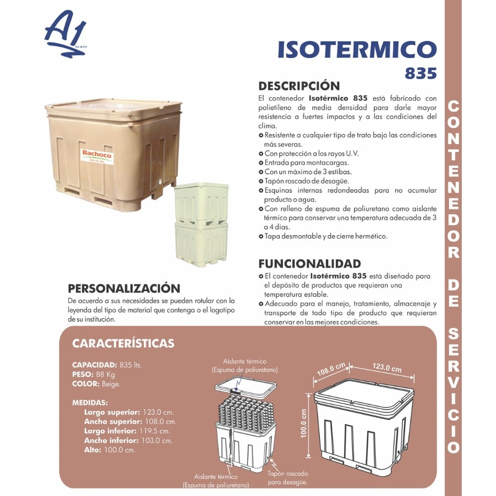 El contenedor isotérmico 835 es una solución de alta calidad diseñada para resistir diferentes climas, ideal para el depósito y traslado de productos que requieren una temperatura estable. Fabricado en polietileno de media densidad, garantiza resistencia superior a fuertes impactos y condiciones climáticas adversas. Su relleno de espuma de poliuretano actúa como un aislante térmico eficiente, permitiendo conservar una temperatura adecuada durante 3 a 4 días. Este contenedor robusto y funcional incluye características como protección contra rayos UV, entrada para montacargas, capacidad máxima de tres estibas, tapón roscado de desagüe, esquinas internas redondeadas que previenen acumulaciones y una tapa desmontable de cierre hermético, asegurando tanto la higiene como la calidad del contenido almacenado y transportado.