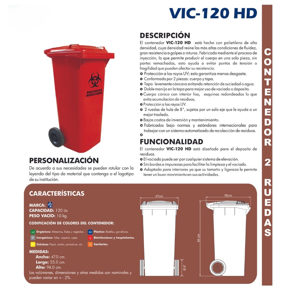 Aplicaciones: El contenedor VIC-120 HD es ideal para el depósito de residuos en una variedad de entornos, incluyendo áreas industriales, comerciales y residenciales. Su diseño evita malos olores y focos de infección, asegurando un entorno más limpio y saludable.+