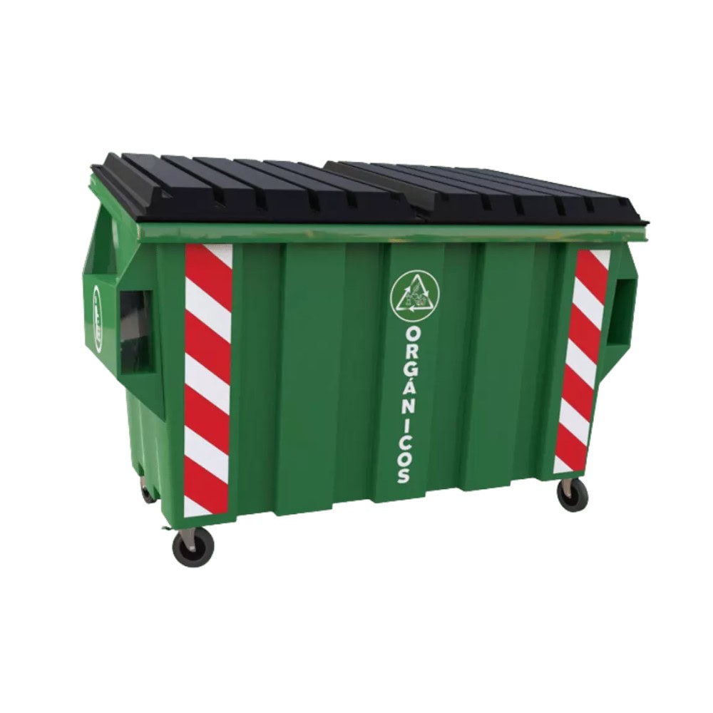 El diseño incluye dos brazos laterales de levantamiento que facilitan el vaciado mediante sistemas automatizados, cumpliendo con normas y estándares internacionales para la recolección de basura. Las esquinas redondeadas en el interior del contenedor previenen la acumulación de residuos, facilitando la limpieza y mantenimiento.