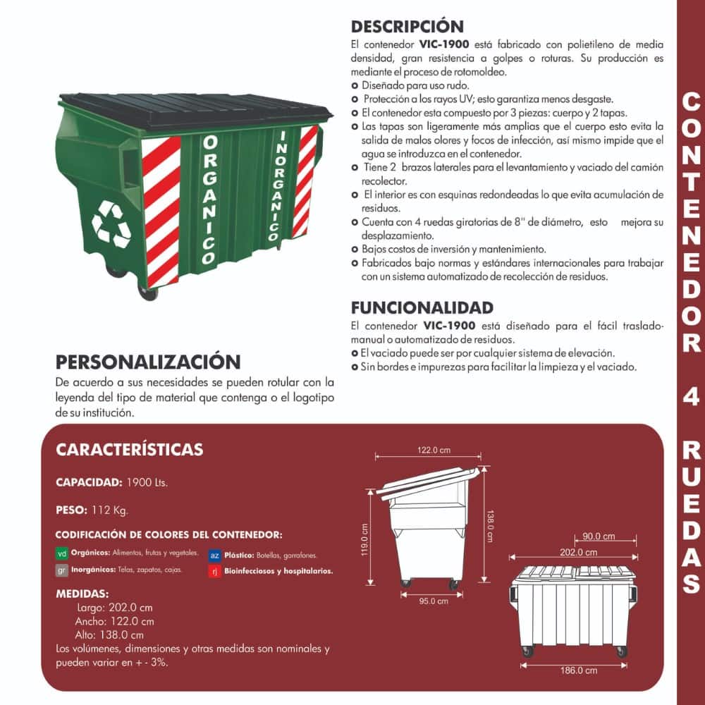Con cuatro ruedas giratorias de 8 pulgadas de diámetro, el VIC-1900 ofrece un desplazamiento óptimo y una manipulación sencilla, adaptándose a diferentes entornos y necesidades operativas. Su fabricación de alta calidad garantiza bajos costos de mantenimiento, haciendo de este contenedor una inversión eficiente y duradera.