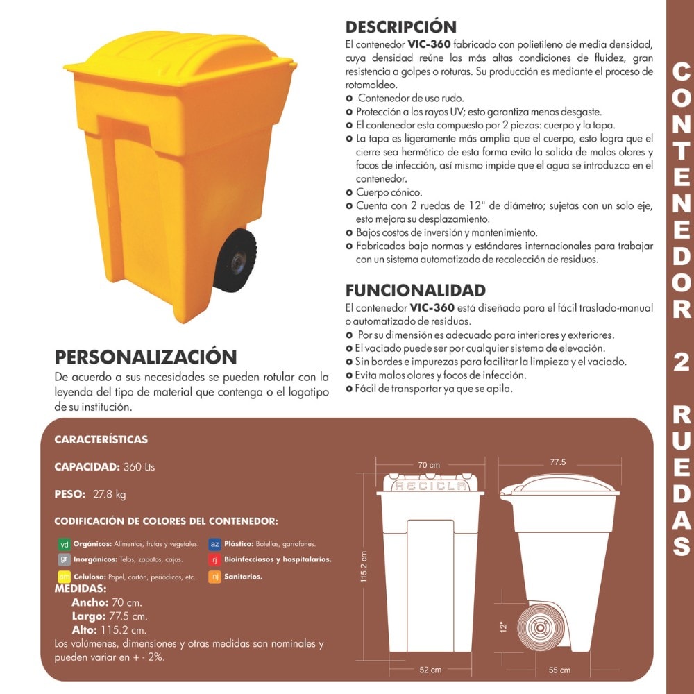 El contenedor VIC-360 está especialmente diseñado para el depósito de residuos, siendo adecuado tanto para uso en interiores como exteriores debido a sus dimensiones versátiles. Su construcción permite un transporte sencillo y cómodo.
