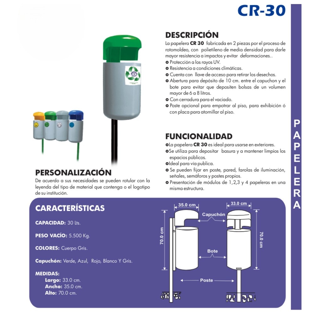 Además, cuenta con una cerradura para facilitar el vaciado. Se puede optar por un poste para empotrarla al piso, usarla en exhibición o fijarla con una placa al suelo. Es ideal para exteriores y para mantener limpios los espacios públicos, siendo adecuada para vías públicas y pudiendo ser fijada a postes, paredes, farolas, señales, semáforos y postes propios. La CR 30 está disponible en módulos de 1, 2, 3 y 4 papeleras en una misma estructura.