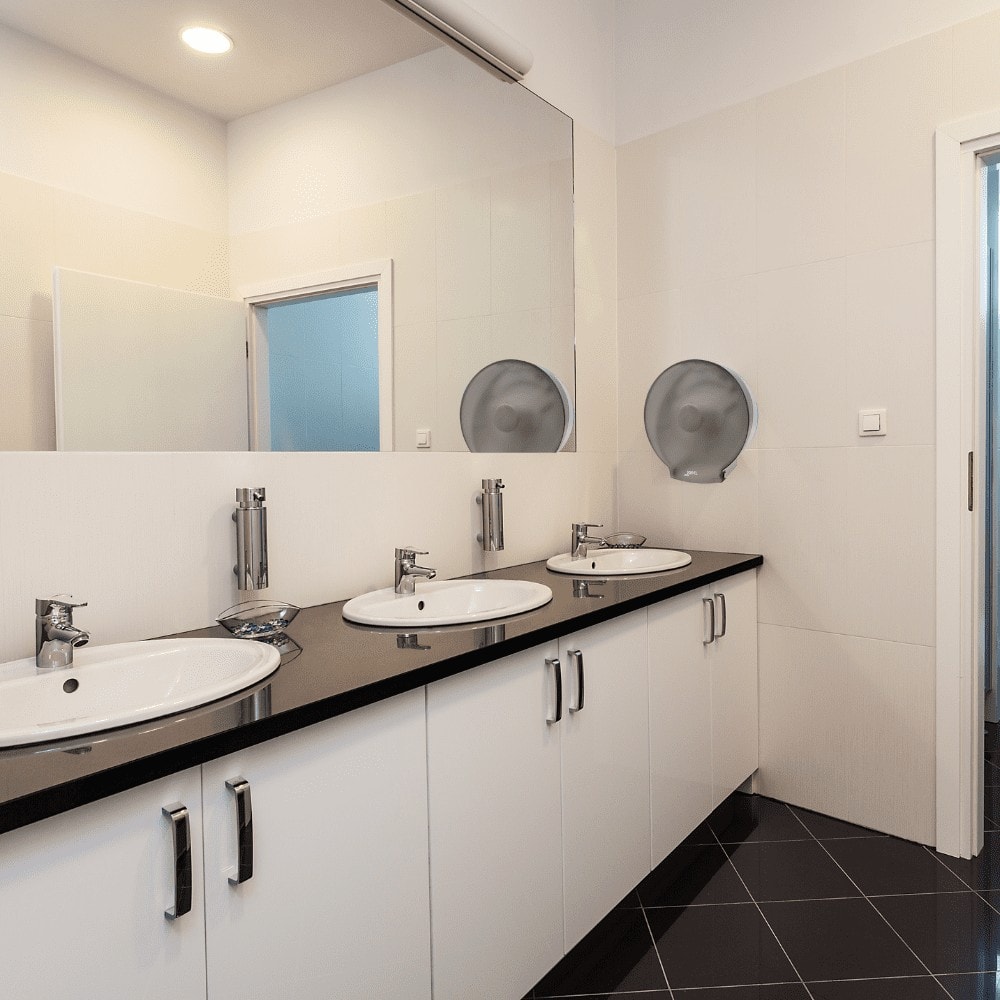 Portarrollo para colocar un rollo de papel de 9″ (230 mm). Tapa transparente, base blanca con cerradura azur. El producto se recomienda para W.C. públicos