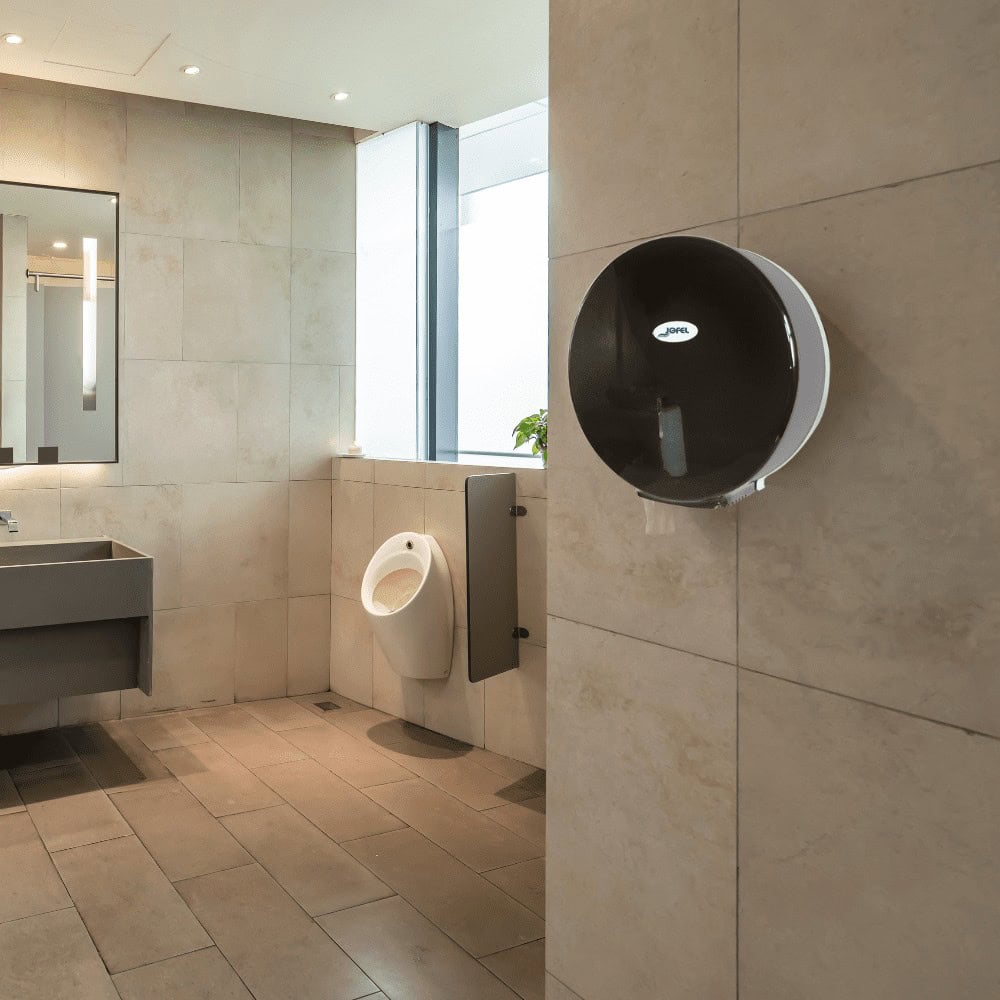 Portarrollos para colocar un rollo de papel de 12″ (305 mm). Tapa humo – Base Blanca.