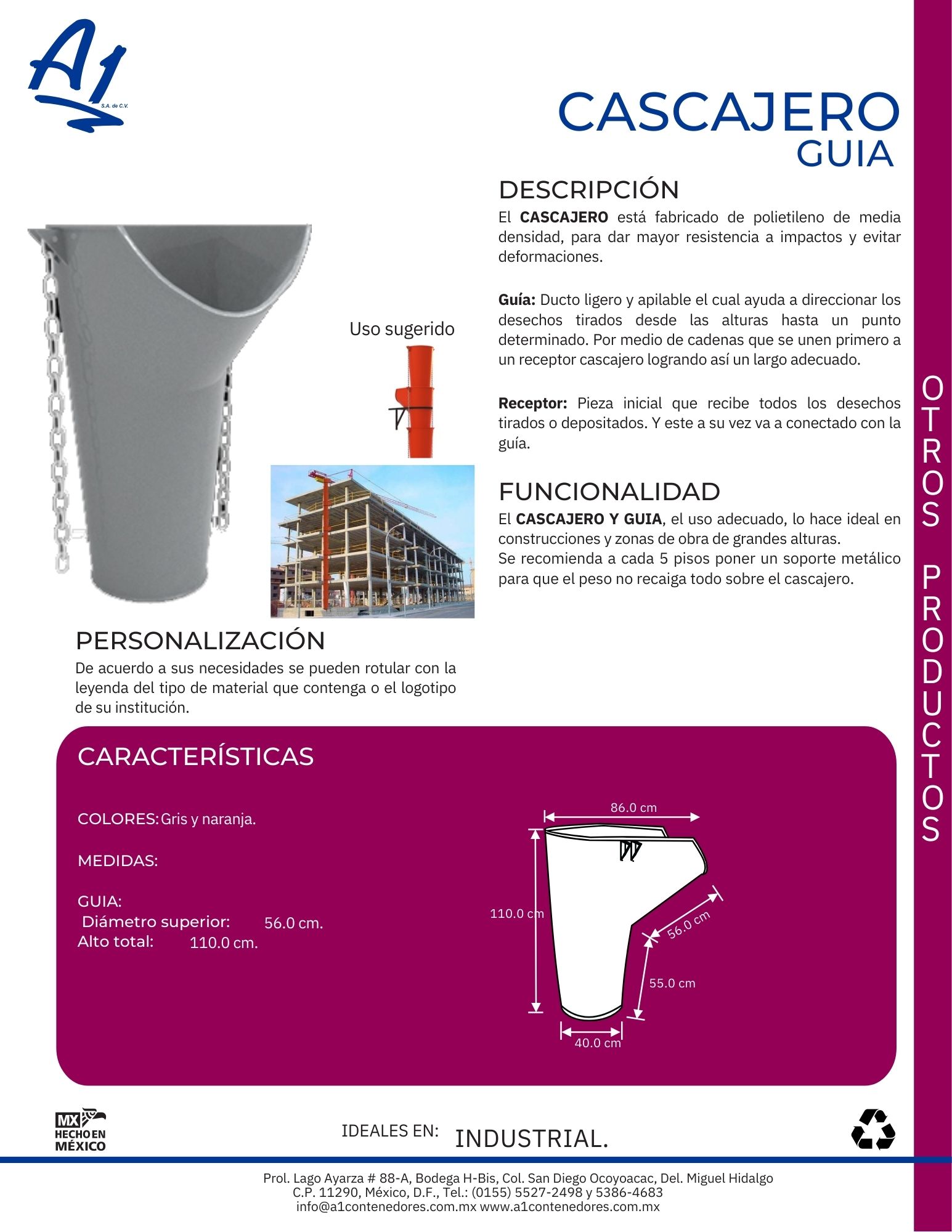 El CASCAJERO está fabricado mediante el proceso de rotomoldeo con polietileno de media densidad, para dar mayor resistencia a impactos y evitar deformaciones.
