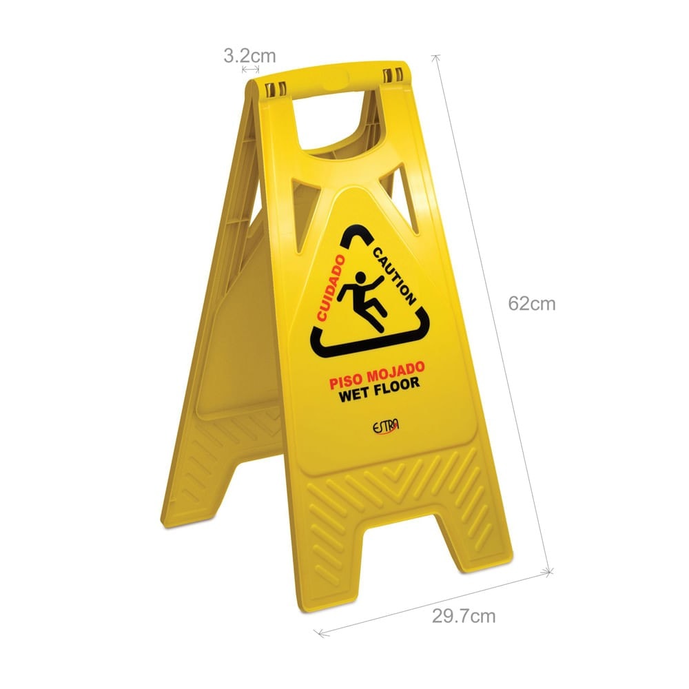 Mantén la seguridad y la calidad en tus espacios limpios con este señalamiento preventivo de piso mojado. Su diseño plegable permite transportarlo fácilmente y almacenarlo en espacios reducidos, asegurando practicidad en cualquier entorno.