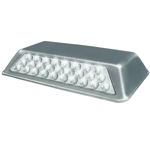 Fabricado en acero inoxidable y diseñado para un alto total de los vehículos. Adecuado para tránsito pesado. Con 3 líneas de 27 esferas reflejantes de 1.1 cm de diámetro.