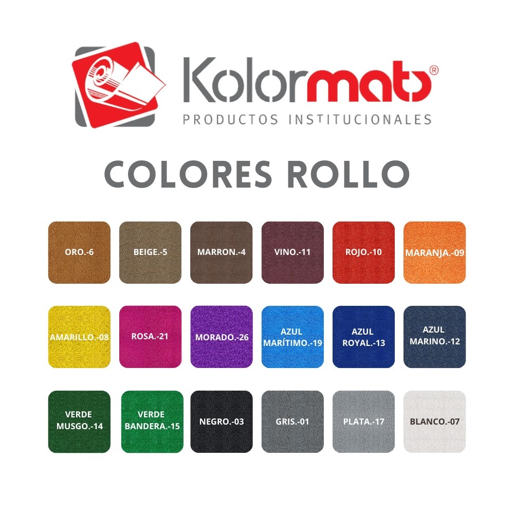 ORO, BEIGE, MARRÓN, VINO, ROJO, NARANJA, AMARILLO, ROSA, MORADO, AZUL MARÍTIMO, AZUL ROYAL, AZUL MARINO, VERDE MUSGO, VERDE BANDERA, NEGRO, GRIS, PLATA, BLANCO
