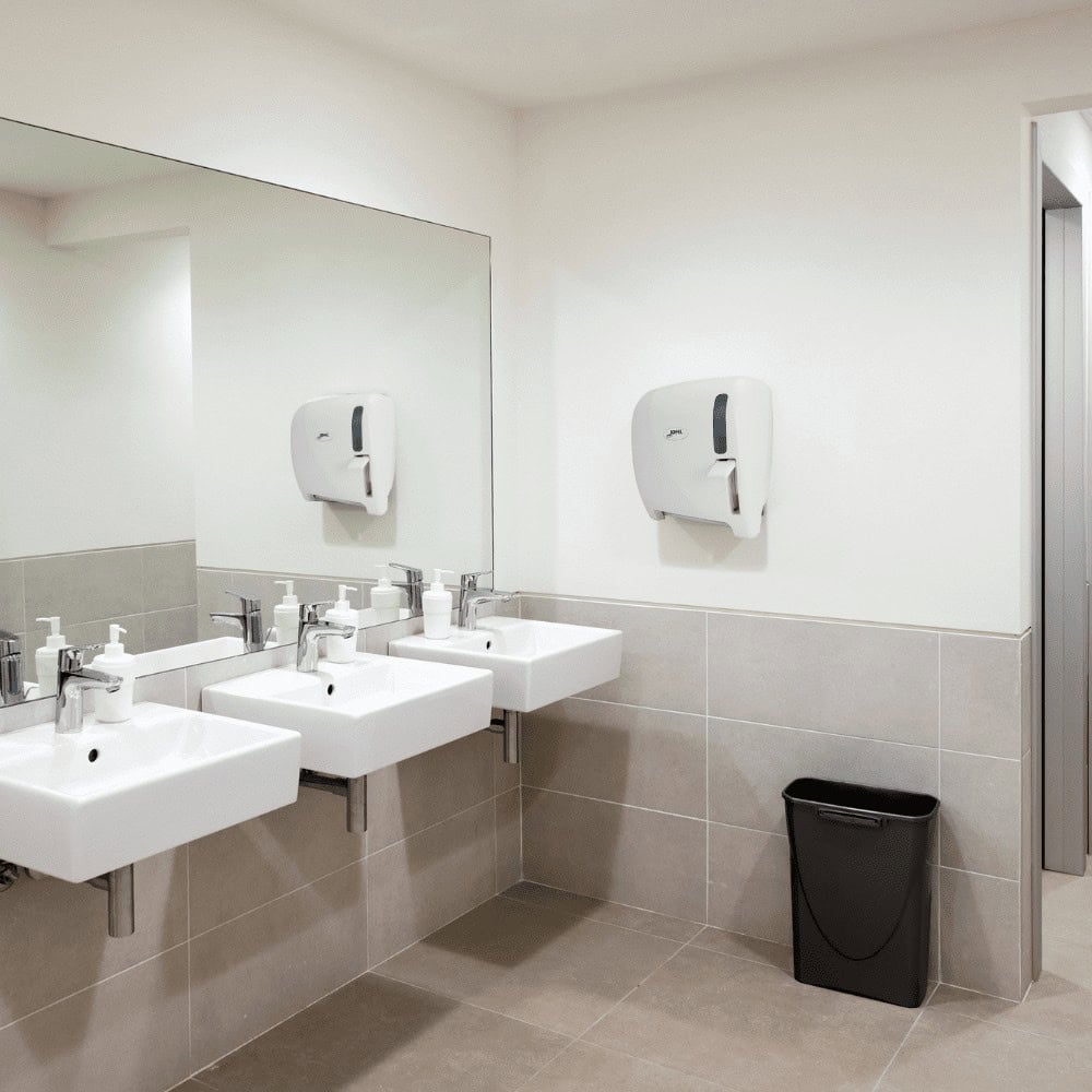 Dispensador de Toalla en rollo, accionamiento por Palanca, cerradura de tres puntos. Se sugiere colocar 1 rollo de 8″ (203 mm). Color de producto: Base y Tapa Blanca, con visor en la tapa para ver consumo de papel. Recomendado para lugares de alta rotación y especialmente recomendado para oficinas, hospitales, clínicas, consultas, etc.